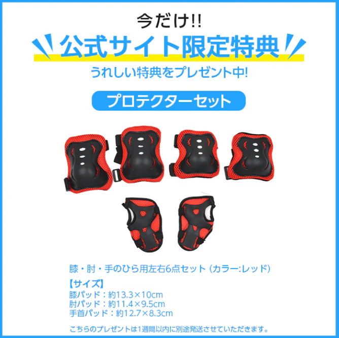 - 公式サイトから購入で今ならプロテクター3点セット付き(手・肘・膝)