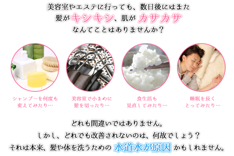 毎日使っている水だからこそ、肌や髪にじわじわとダメージを与えているんです。