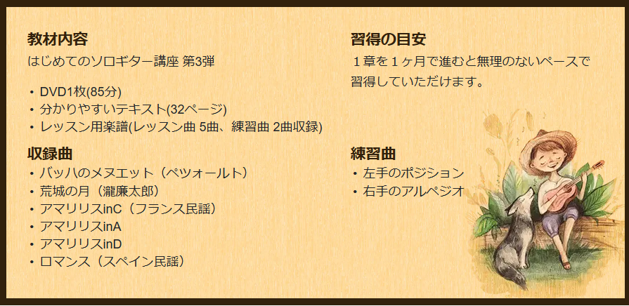 古川先生の「ソロギター講座3弾セット」は、初心者から経験者まで安心して楽しめる教材です。