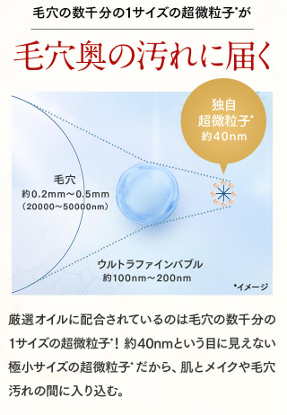 毛穴の数千分の1サイズという極小の微粒子が、メイクと肌のすき間にスッと入り込み、汚れを包み込んでオフ。