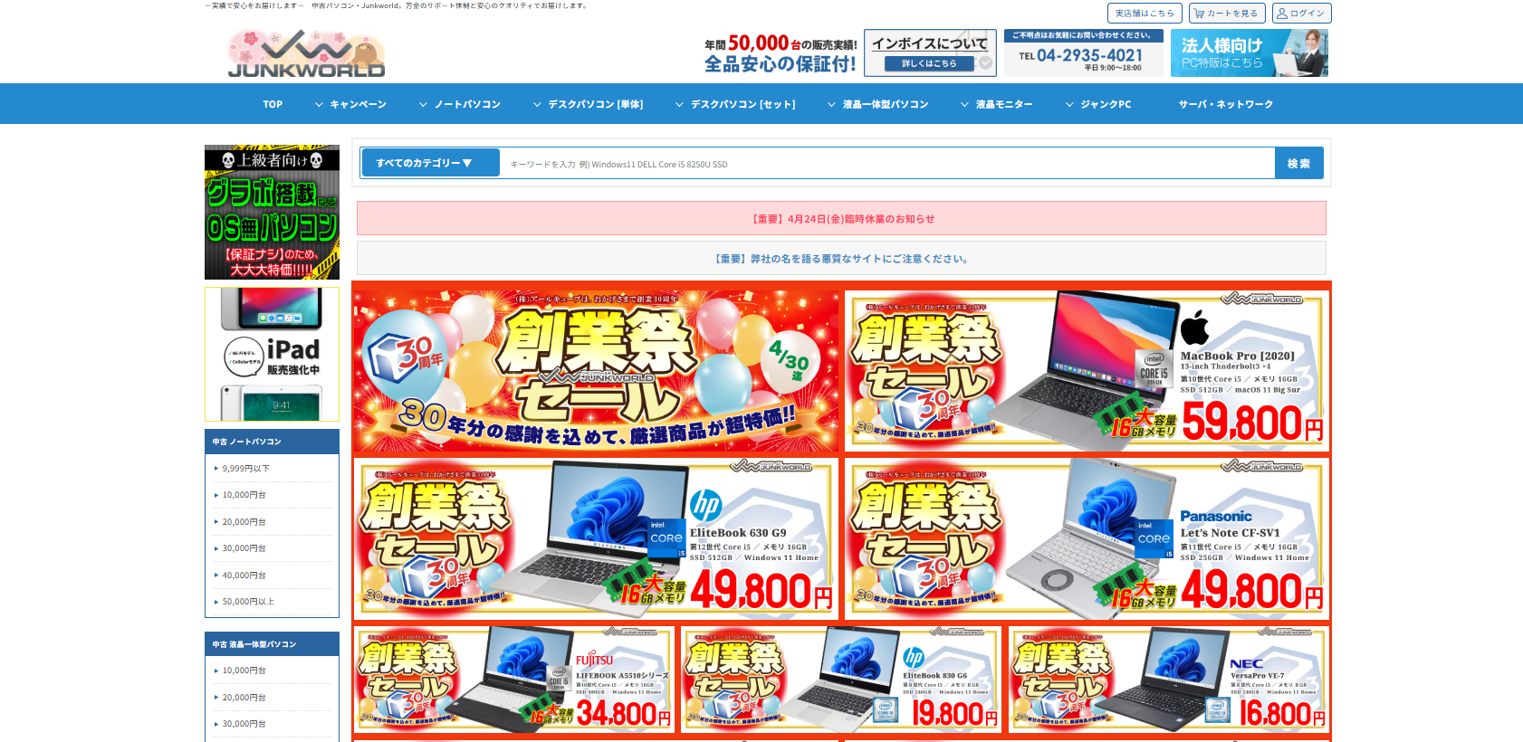 全品保証付きの中古パソコンショップ「JUNKWORLD」です。